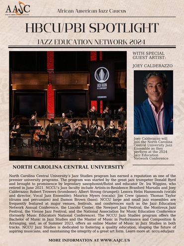 The African American Jazz Caucus remains committed to celebrating and uplifting the contributions of HBCU and PBI music programs, and looks forward to honoring them for years to come. If you know of a jazz program that would like to perform during the AAJC HBCU/PBI Spotlight Ensemble session at future JEN Conferences, which are held each year in January, please contact us here. . Application and conference dates can be found on the Jazz Education Website. AAJC and Jen will publicize when applications open.